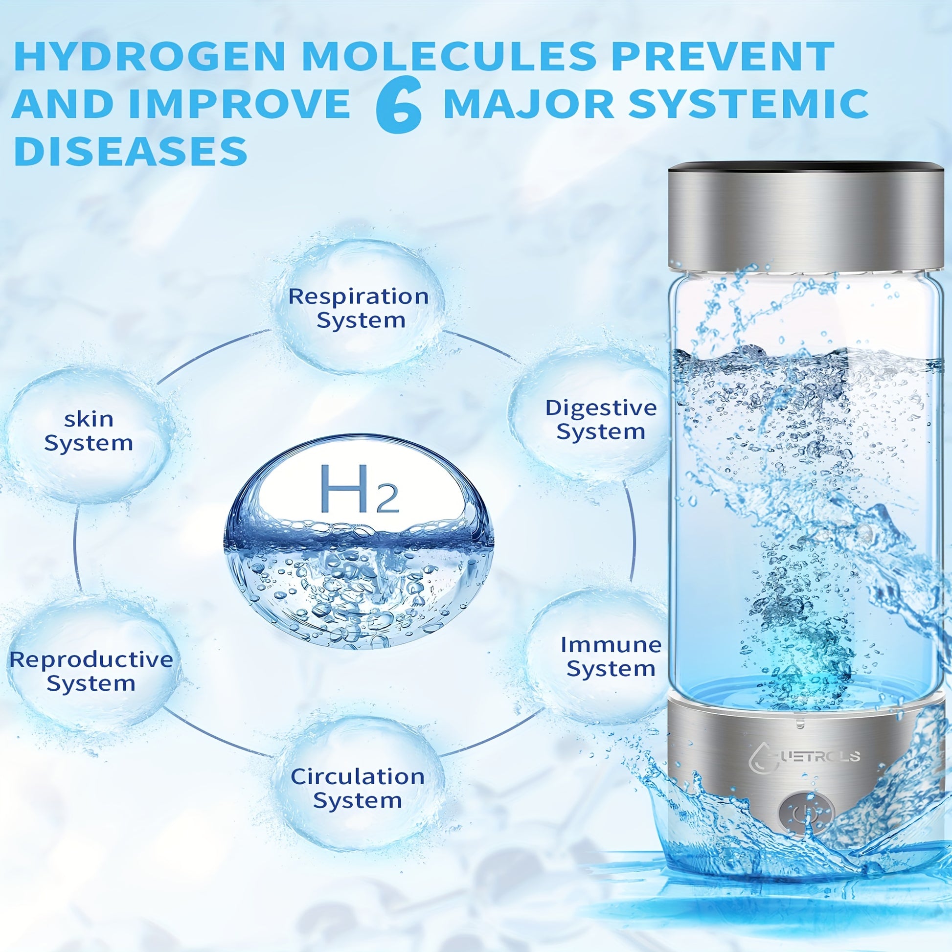 In just 3 minutes, the echo go hydrohealth hydrogen Water Bottle Generator improves water quality by producing up to 1400ppb of hydrogen ions using advanced SPE and PEM electrolysis technology. It separates hydrogen and oxygen gases efficiently and includes a breathable vent at the bottom to release residual chlorine and other gases. Enjoy the convenience of staying hydrated on-the-go with alkaline water infused with hydrogen ions for superior hydration.